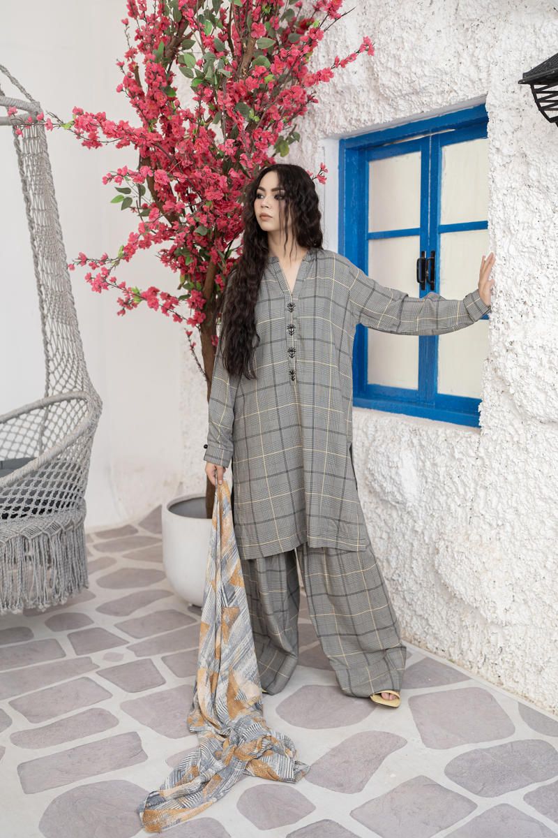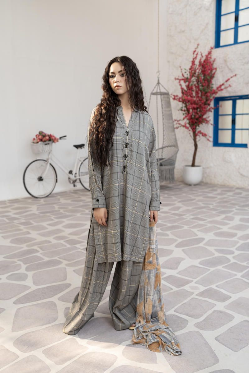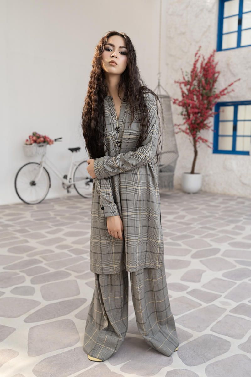 CHECKRED PRINTED LINEN CO-ORD SET WITH SLIGHT HANDWORK DETAILING ON NECKLINE