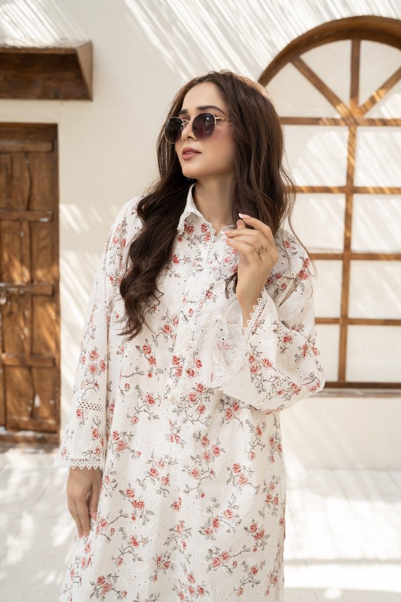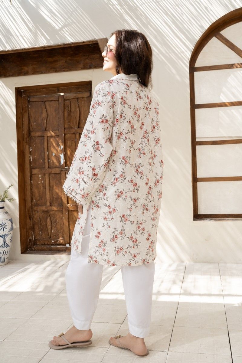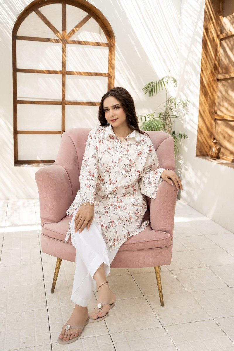 CHIKANKARI TUNIC WITH EMBELLISHED APPLIQUE COLLAR AND LACE DETAILING